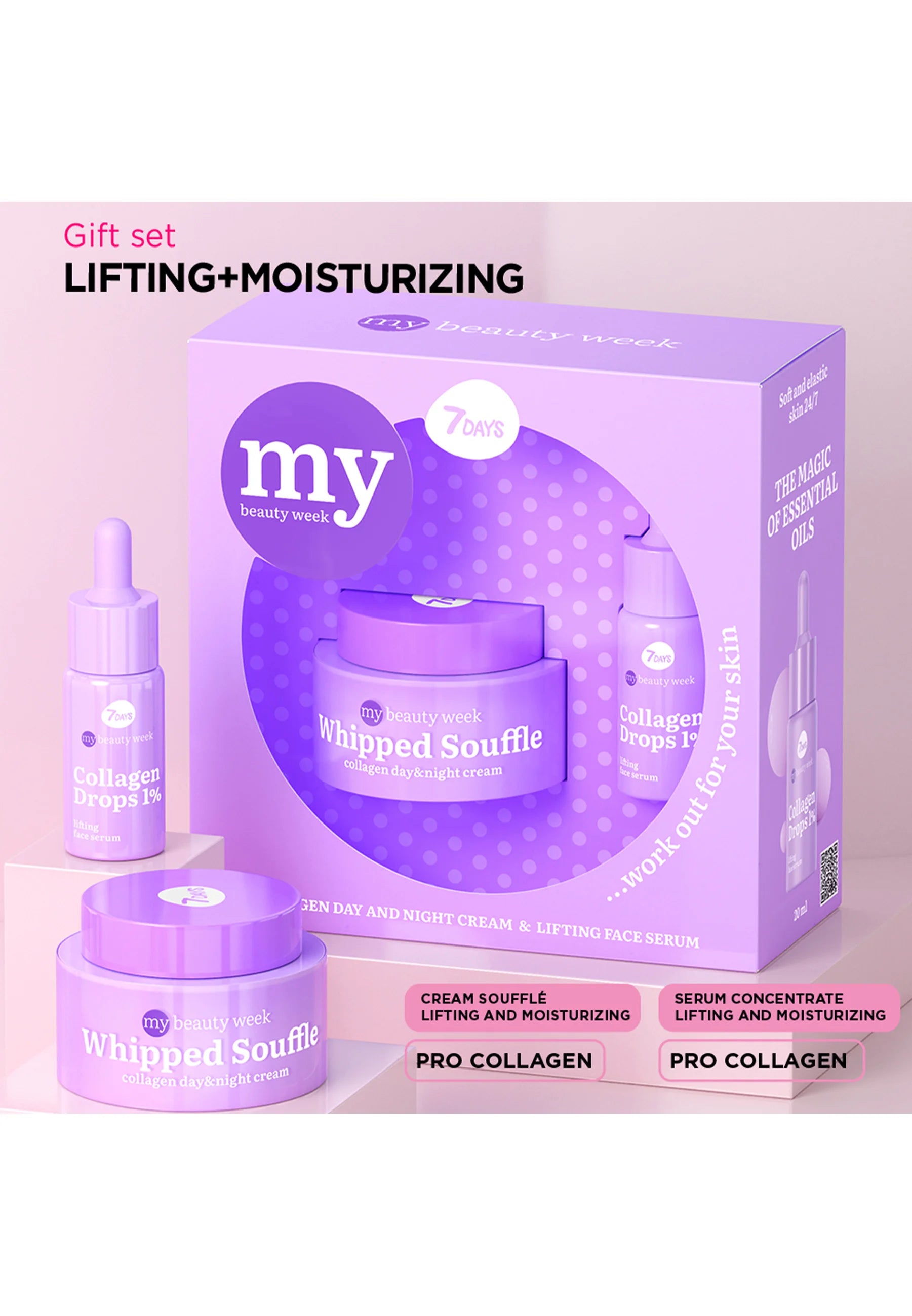 Hudvårdssetet 7DAYS #MYBEAUTYWEEK TRAINING: Icke-injicerbart anti-aging-serum COLLAGEN DROPS har en kraftfull lyftande effekt och hjälper till att släta ut rynkor, återfukta och ge elasticitet. Facial Day&Night Cream WHIPPED SOUFFLE med kollagen ger näring, vitaliserar och saktar ner åldrandeprocesserna.